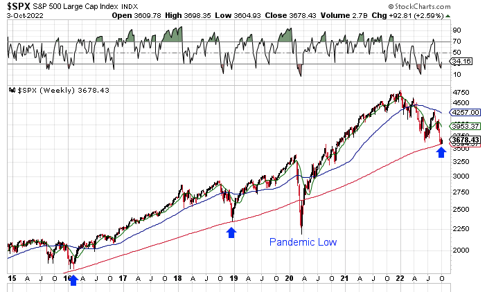 Aside from the pandemic low (which was also a 4 year cycle low) stock have been finding consistent support at the rising 200 week MA. So a close above the 10 day MA would signal a possible early DCL – using Friday as the stop. But a close below the 200 week MA would indicate a decline into a 4 year cycle low.