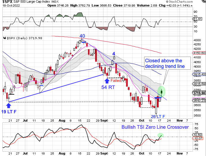 After forming the huge bullish reversal on Thursday, stocks are being contained by the declining trend line — until Tuesday.