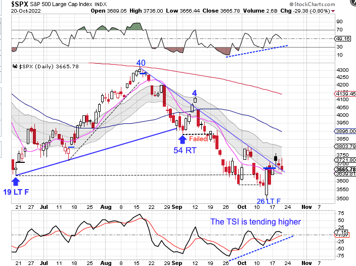 The decline into the day 26 low caused the 10 day MA to decline sharply. Stocks may be consolidating to allow the 10 day MA to flatten out before it can turn higher. However, stocks are still in a daily downtrend. If stocks close below the 10 day MA that will indicate a continuation of the daily downtrend and deliver a cycle band sell signal.