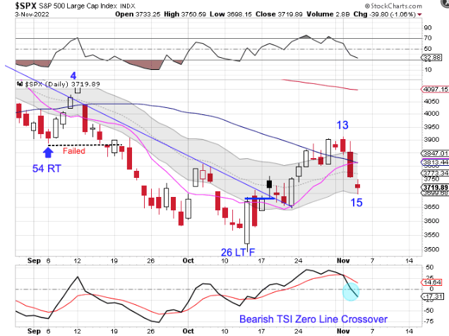 Bear Case — The Fed raising rates by .75% caused stocks to drop 2.5% on Wednesday and then another 1.06% on Thursday. Closing convincingly below the converging 50 day MA and 10 day MA indicates something sinister if afoot. A close below the lower daily cycle band will end the daily uptrend and begin a daily downtrend.