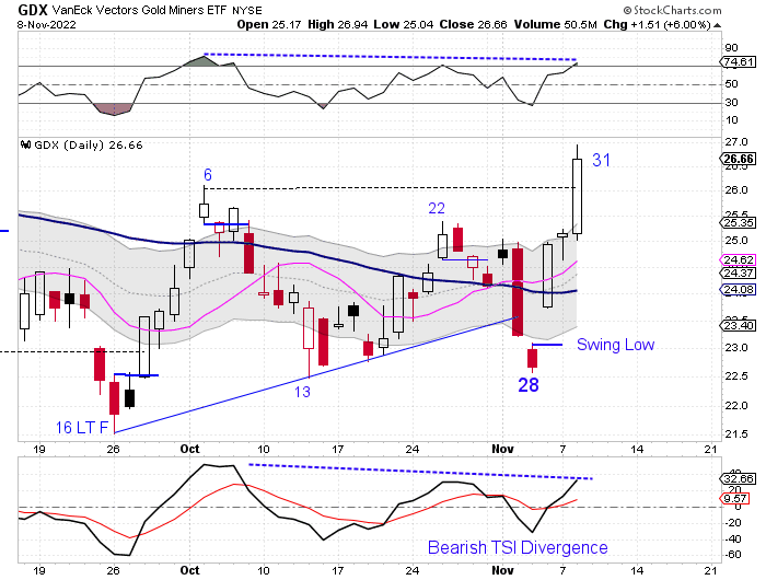 The Miners have not formed a clearly defined DCL since late September. The decline into the day 28 low did not satisfy the conditions for a DCL. Which makes Tuesday, day 31 for the daily cycle. The Miners rallied for over 17% over the past three days and are now stretched above the 10 day MA and the 50 day MA. They will likely need to consolidate this move. We could see a sideways consolidation but with the Miners being in their timing band for a DCL, we need to be alert for a daily cycle decline. Currently the Miners are in a daily uptrend. They will remain in their daily uptrend unless they close below the lower daily cycle band.