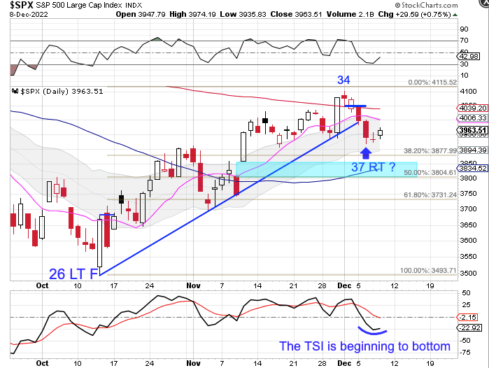 Stocks should go on to turn the 10 day MA lower in order to complete its daily cycle decline. Instead, stocks drifted sideways on Wednesday and Thursday. Stocks are currently in a daily uptrend. If they form a swing low above the lower daily cycle band and then close above the 200 day MA that would also indicate that stocks will remain in their daily uptrend and signal a cycle band buy signal. We would then label day 37 as the DCL.