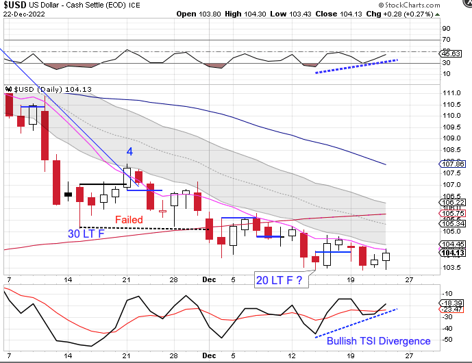 The dollar printed its lowest point on day 20, placing it in the early part of its timing band for a DCL. The bullish divergence on the oscillator point towards day 20 being the DCL. A close above the 10 day MA would signal the new daily cycle.