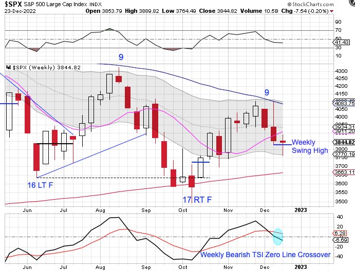 Stocks formed a weekly swing high this week. This is a very bearish setup. A peak on week 9 sets stocks up for a left translated weekly cycle formation. Stocks are currently in a weekly downtrend. Forming a weekly swing high below the upper weekly cycle band that will indicates a continuation of their weekly downtrend and signals a weekly cycle band sell signal.