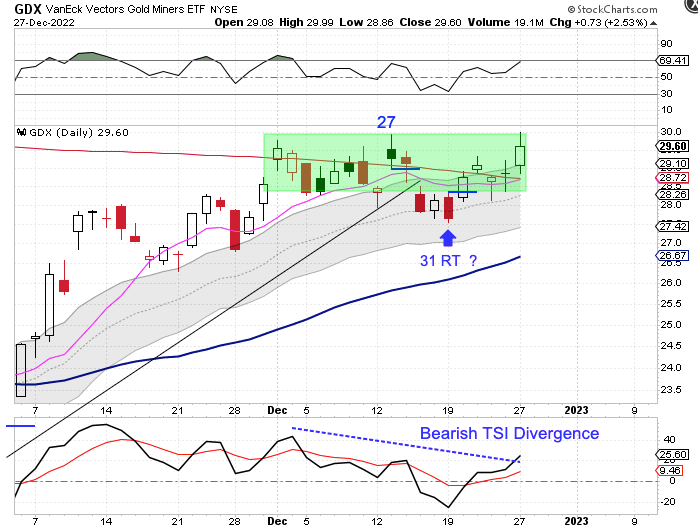 The Miners managed to do so on Wednesday and Friday of last week. Even though the Miners delivered some bullish follow through on Tuesday, they are still caught in consolidation. The Miners really need to break free of consolidation. in order for a trending move to develop. Until they break free — the 200 day MA can be used as the stop.