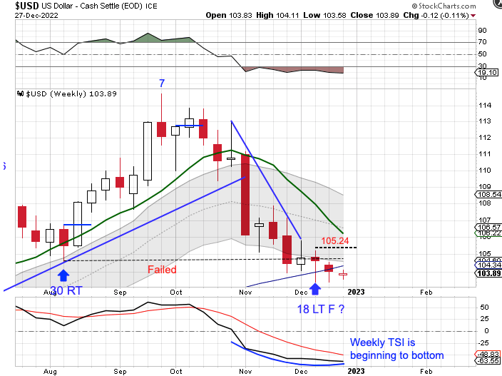 The dollar printed its lowest point on week 18. That places the dollar in its timing band for an ICL. A break above 105.24 will form a weekly swing low to signal the new intermediate cycle. Recovery of the 50 week MA will be a good signal that week 18 was the ICL. The dollar is currently in a weekly downtrend. The dollar will remain in its weekly downtrend unless it closes back above the upper weekly cycle band.