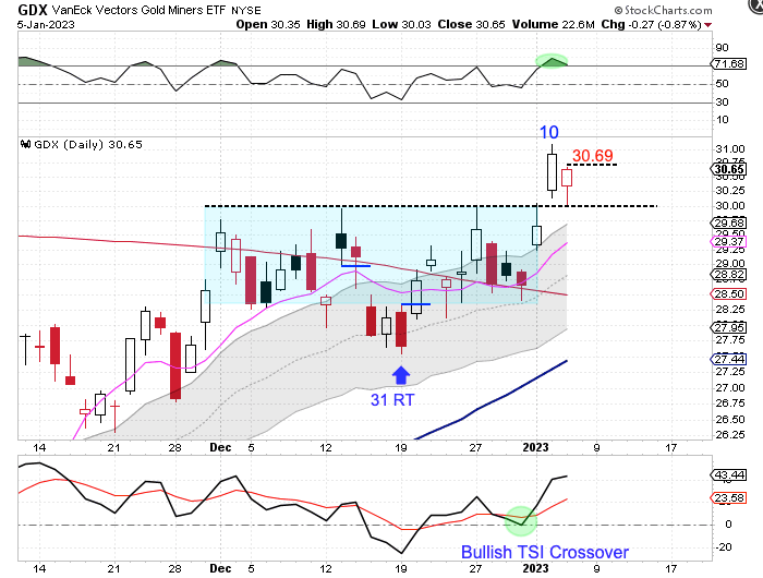 The Miners backtested the breakout level on Thursday. Miners are currently in a daily uptrend. If the Miners form a swing low above the upper daily cycle band that will indicate a continuation of the daily uptrend and signal a cycle band buy signal. A break above 30.69 will form a daily swing low and close below the 30 level can be used as the stop.