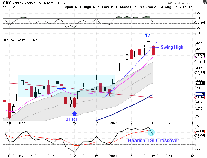 The Miners formed a swing high on Tuesday in reaction to the dollar’s swing low. The Miners closed 3.46% lower and also closed below the daily cycle trend line. A close below the 10 day MA will signal the daily cycle decline.