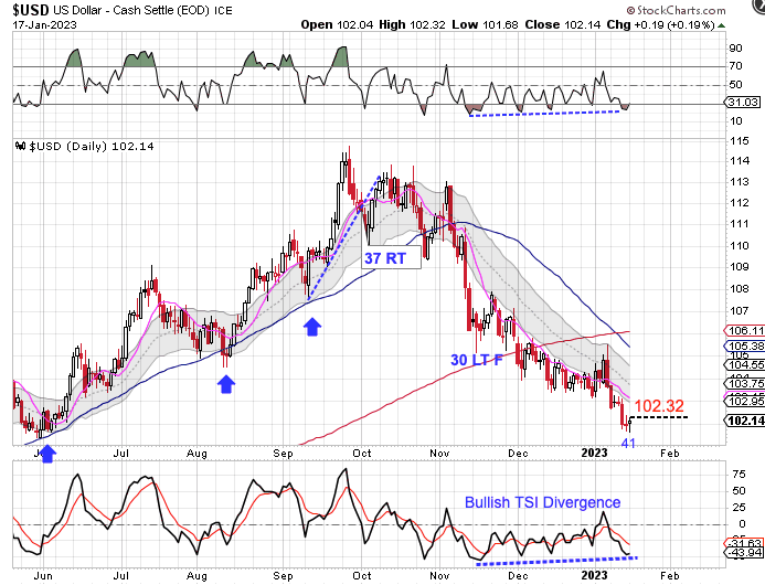 A break above 102.32 will form a swing low. Then a close above the 10 day MA would have us label day 41 as the DCL.