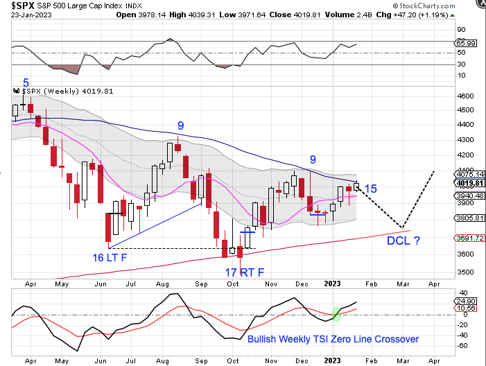 At 15 weeks, stocks are nearing their timing band for an intermediate cycle decline. If the resistance at the 50 week MA holds, stocks will likely decline into their ICL. And stocks would then have a better chance at sustaining a trending move if they break above the declining 50 week MA soon after emerging from the ICL as oppose to doing so on week 15.