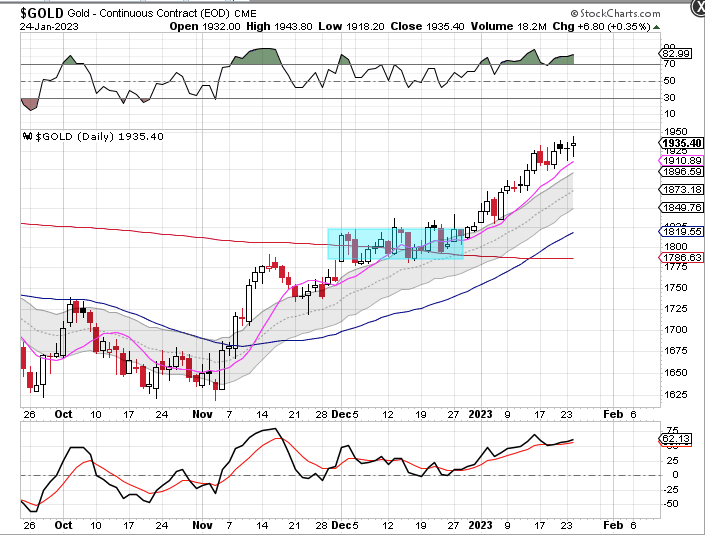 Gold ran into resistance at the 200 day MA and spent the better part of December in consolidation. Then early January gold resumed its uptrend.
