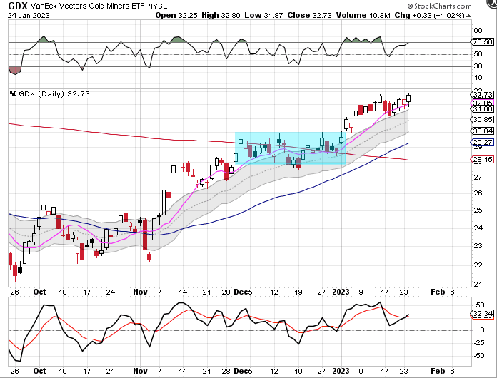 The Miners followed a very similar pattern. They also closed above the 50 day MA in early November and has since been a daily uptrend. They also ran into resistance at the 200 day MA and spent the better part of December in consolidation before resuming its uptrend in January.