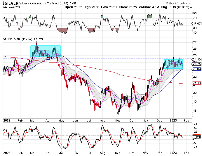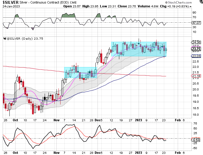 After closing above the 50 day MA in early November, Silver also ran spent a large part of December, as well as most of January, in consolidation.
