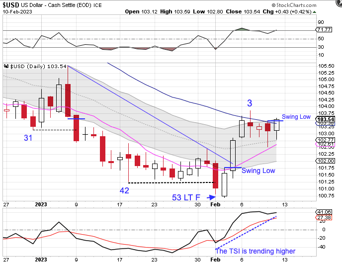 Closing above the 50 day MA on Friday provides more evidence that the ICL has been set. The dollar is currently in a daily uptrend. Friday’s swing low indicates a continuation of the daily uptrend and signals a cycle band buy signal.