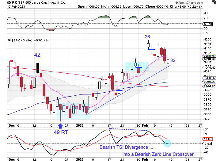 Stocks printed its lowest point on Friday, day 32, to place it in its timing band for a DCL. Stocks will need to break below the daly cycle trend line and turn the 10 day MA lower in order to complete its daily cycle decline. Stocks are currently in a daily uptrend. They will remain in their daily uptrend unless they close below the lower daily cycle band.
