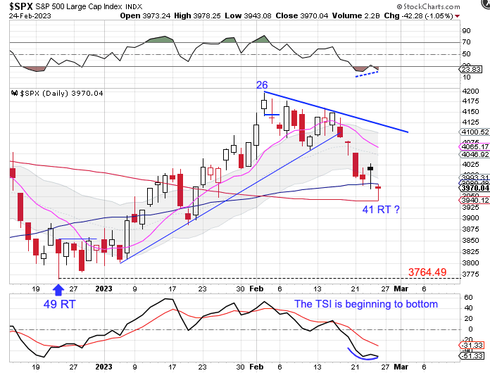 Stocks printed their lowest point on Friday, day 41, placing them deep in their timing band for a DCL. Stocks formed a bullish reversal off support from the 200 day MA on Friday. This eases the parameters for forming a daily swing low. A swing low and close back above the 50 day MA will signal a new daily cycle.