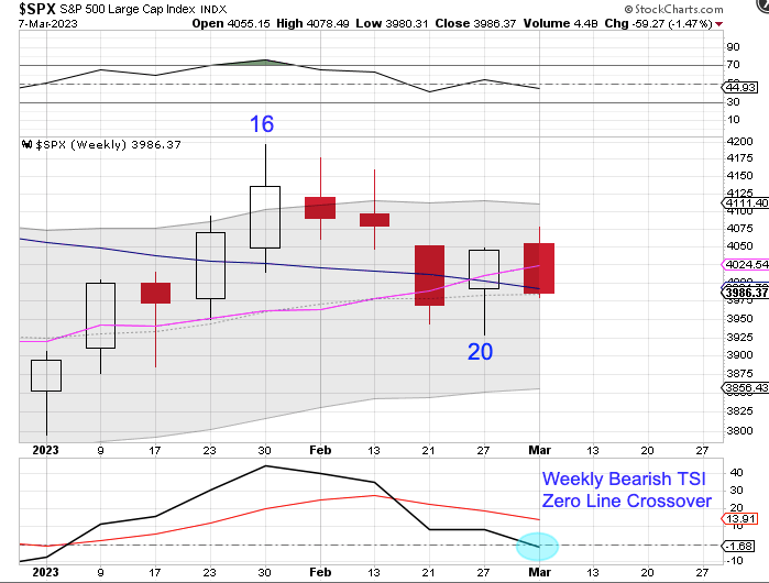 Stocks are on week 21 for the intermediate cycle. That places them in their timing band for an intermediate cycle decline. Stocks are in the process of losing both the 10 week MA and the 50 week MA. Any more bearish follow will signal the intermediate cycle decline.