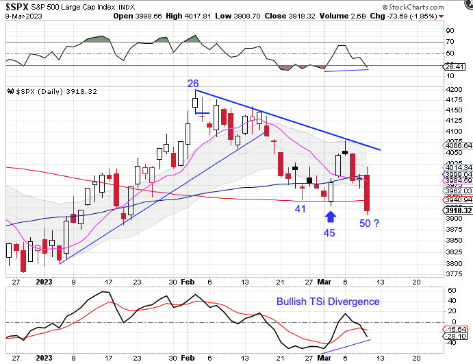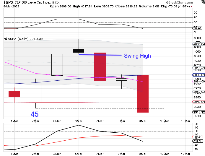 The rally out of the day 45 low saw stocks close above both the 50 day MA and the 10 day MA. That indicated that day 45 was the DCL. However, stocks were unable to deliver any bullish follow and break above the declining trend line. That along with the bullish divergence on the oscillators point to Thursday as being day 50 of a stretched daily cycle. What is clear is that stocks are on week 21 of their intermediate cycle. Stocks are clearly in the process of seeking out their ICL. Until stocks form a swing low and deliver a trend line break, we have to assume that stocks will continue their intermediate cycle decline.