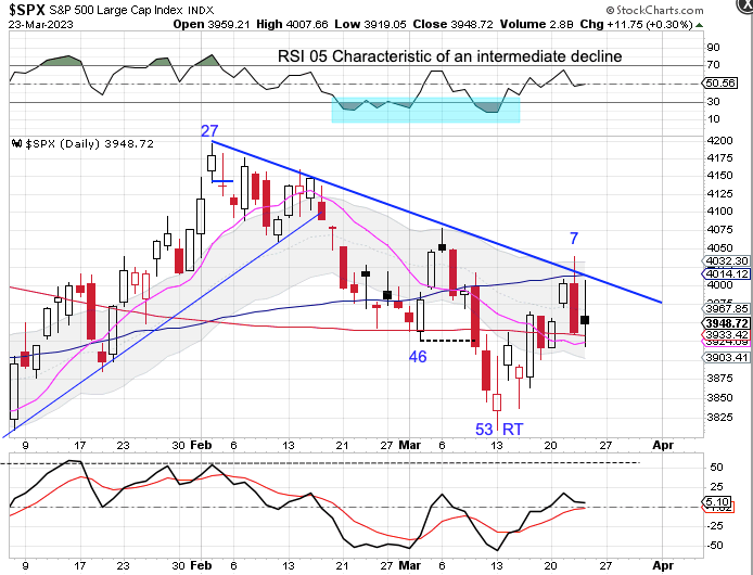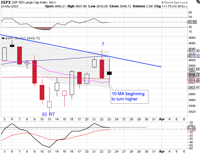 It appears that stocks did “enough” to label day 53 as the DCL. Stocks closed above the 200 day MA and the 10 day MA as it rallied out of the day 53 low. Stocks broke the declining trend line.
