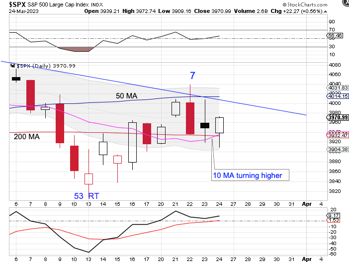 Stocks are now being squeezed by the 200 day MA and the 50 day MA. Stocks are 23 weeks into its intermediate cycle. Stocks have not formed a failed daily cycle to indicate that week 22 was the ICL.