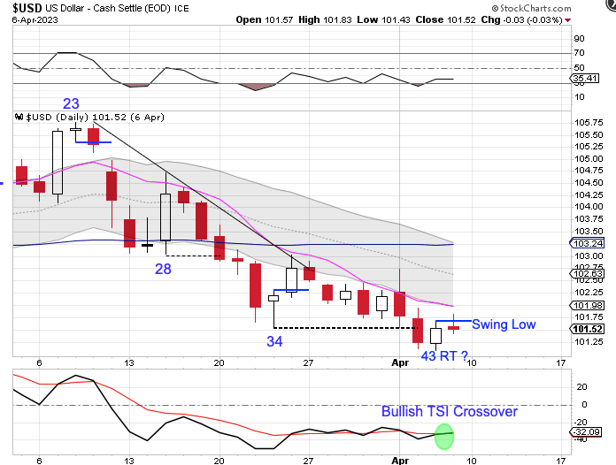 The printed its lowest point on Thursday, day 43, placing it deep in its timing band for a DCL. The dollar formed a swing low on Thursday. A close above the 10 day MA will signal the new daily cycle. The dollar is currently in a daily downtrend. The dollar will continue in its daily downtrend unless it closes back above the upper daily cycle band.