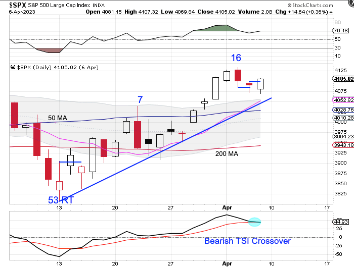 The previous 2 daily cycles were stretched at 49 and 53 days respectively. So it is possible to see a shortened daily cycle, which would help to balance out the cycle counts. If stocks deliver bearish follow through by breaking below the the daily cycle trend line that will signal the daily cycle decline. Stocks are currently in a daily uptrend. Stocks will remain in their daily uptrend unless they close below the lower daily cycle band.