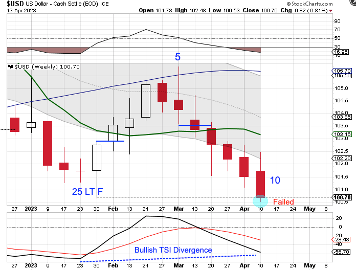 The dollar broke below the January low on Thursday. Breaking below the previous intermediate cycle low forms a failed intermediate cycle.