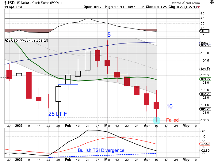 Breaking below the previous intermediate cycle low forms a failed intermediate cycle. The dollar typically forms its ICL between 18 and 24 weeks. With this being only week 10 for the intermediate cycle, that implies that the dollar can trend lower for another 8 to 14 weeks before forming its ICL — which would allow for 1 to 2 more failed daily cycles.