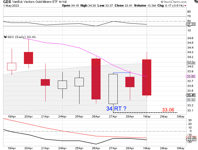 It is not uncommon for the Miners uncut an apparent low before putting in the final cycle low. So if the Miners break below the day 34 low of 33.06 then form a swing low and recover the breakdown level, that will have good odds of marking the DCL.
