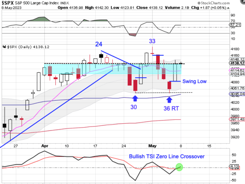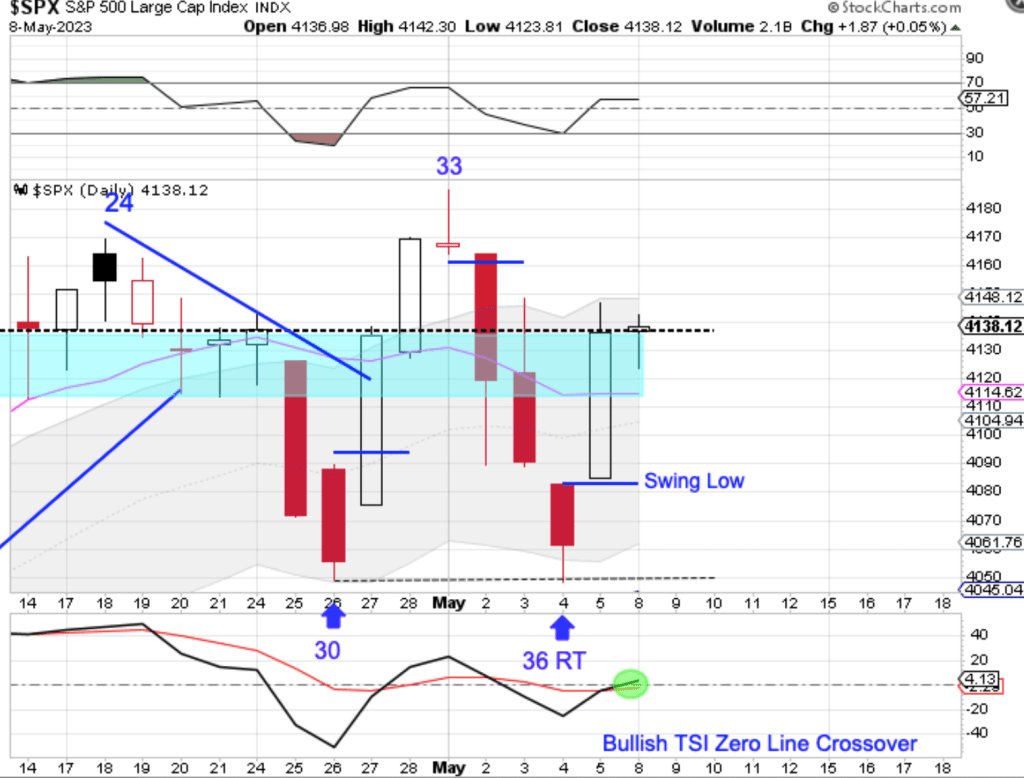 Stocks printed their lowest point on day 36, placing them in their timing band for a DCL. Stocks formed a swing low and closed above the 10. day MA to signal the new daly cycle. However, stocks are working through 5 week resistance at 4138.
