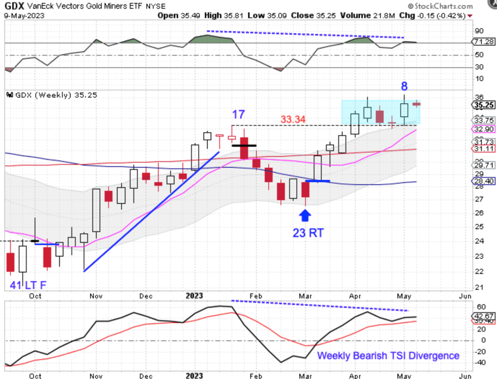 The Miners broke above the January intermediate cycle high in the first week in April. The Miners have been consolidating above the 33.34 Level since.
