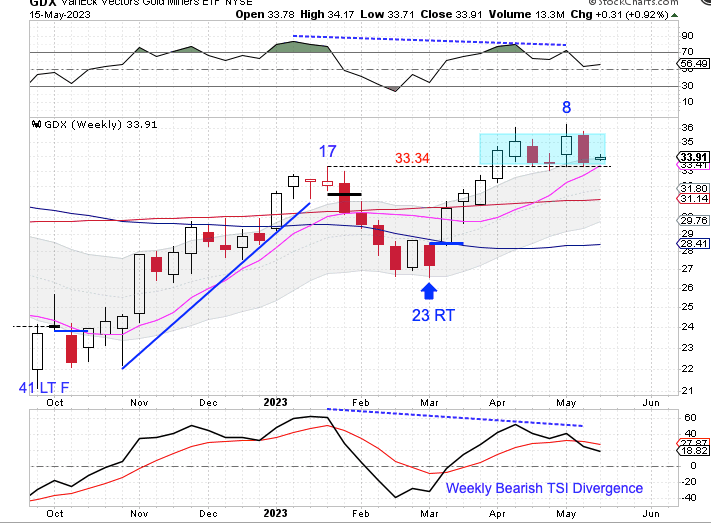 This sideways consolidation has allowed the 10 week MA to catch up to price. The Miners are still in a weekly uptrend. A bullish break out of consolidation will indicate a continuation of the weekly uptrend and signal a cycle band buy signal. But a break below the 33.34 consolidation level would potentially set the Miners up for a left translated weekly cycle formation.