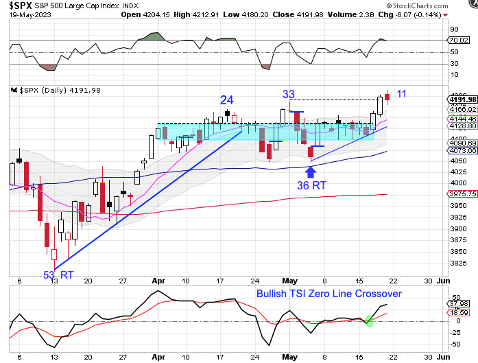 Stocks broke bullishly out of consolidation on Wednesday then delivered bullish follow through on Thursday. We will use this to label day 36 as the DCL.