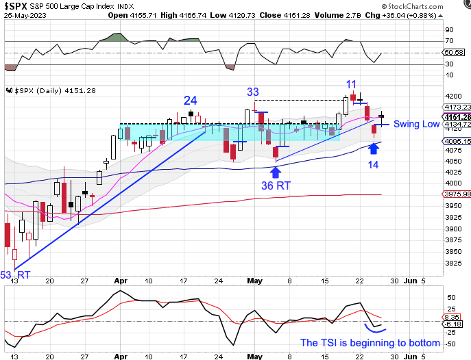 Stocks are still in a daily uptrend. And they formed a swing low above the lower daily cycle band. A close back above the 10 day MA would indicate a continuation of the daily uptrend and signal a cycle band buy signal. In which we would then label day 14 as a half cycle low.