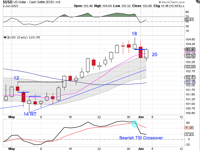 The dollar closed below the 10 day MA on Thursday but recovered it on Friday. If the dollar delivers bearish follow through that would signal the daily cycle decline. However, the dollar is currently in a daily uptrend. If the dollar forms a swing low above the upper daily cycle band that will indicate a continuation of its daily uptrend and signal a cycle band buy signal.