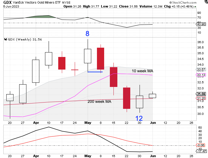 The Miners dropped for 3 straight weeks after peaking on week 8. The Miners lost both the 10 week MA and the 200 week MA in a convincing manner to signal the intermediate cycle decline. However, the Miners delivered a bullish surprise last week.