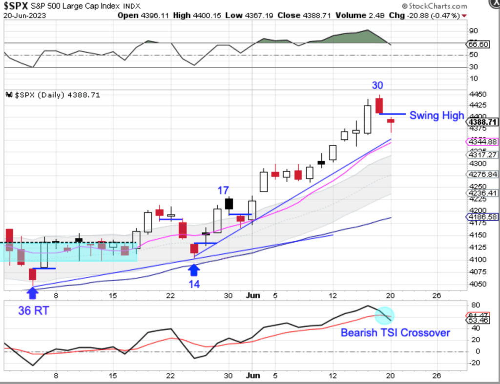 Tuesday was day 31 for the daily equity cycle. That places stocks in their timing band for a daily cycle decline. A break below the daily cycle trend line will signal the daily cycle decline. Stocks are currently in a daily uptrend. Stocks will remain in their daily uptrend unless they close below the lower daily cycle band. Daily cycle declines should last 5 to 7 days and turn the 10 day MA lower as stocks seek out their DCL.
