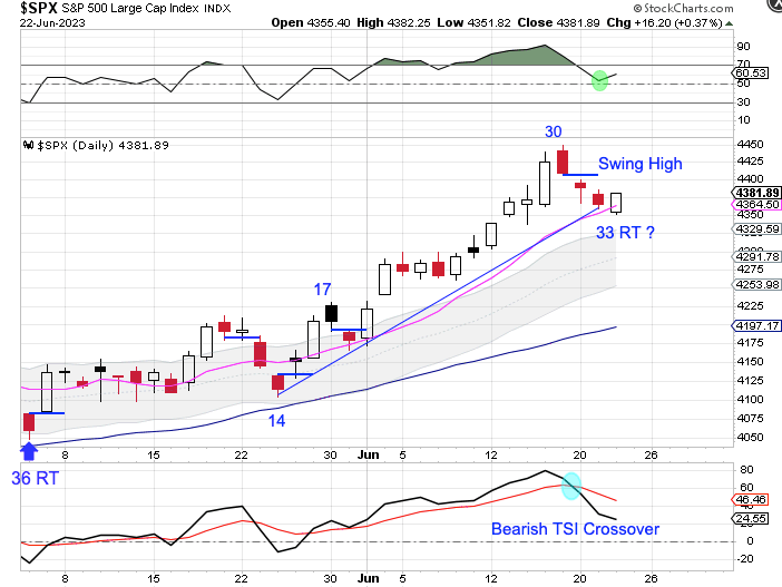 A closer look at the 60 minute chart shows us that stocks recovered the 10 MA but they are still below the 50 MA. So if stocks form a swing low on the daily chart and close above the 50 MA on the 60 min chart then we will label day 33 as the DCL.