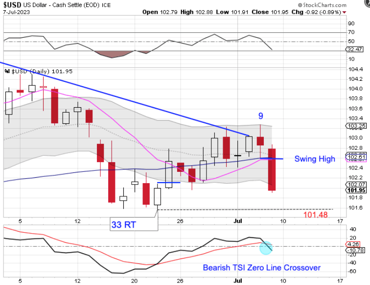The dollar formed a swing high on Friday, closing below the converging 10 day MA and 50 day MA to signal the daily cycle decline. The peak on day 9 indicates a left translated daily cycle formation. That aligns with the dollar is being in a daily downtrend. Forming a swing high below the upper daily cycle band indicates a continuation of its daily downtrend and signals a cycle band sell signal. A break below the previous DCL of 101.48 will form a failed daily cycle and extend the intermediate cycle decline.