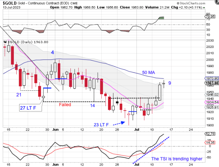 Gold closed convincingly above the 1940 resistance level on Wednesday, turning the 10 day MA higher, to affirm day 23 as the DCL. Gold is currently running into resistance at the declining 50 day MA. Once gold closes above the 50 day MA that will signal that gold has completed its intermediate cycle low.