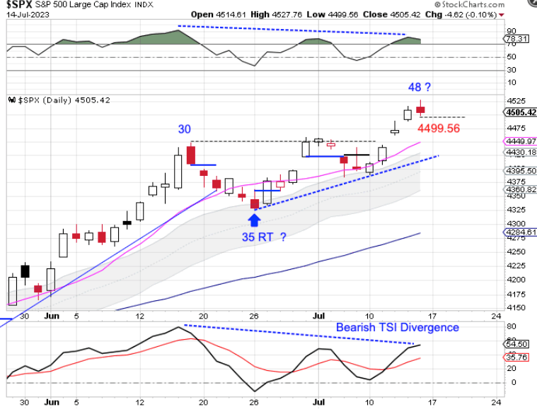While stocks broke out to a new daily cycle high on Friday – there are bearish divergences that are persisting on the oscillators. So we need to keep an open mind that Friday is day 48 of a stretched daily cycle. A swing high and close below the 10 day MA will signal the daily cycle decline. Stocks are currently in a daily uptrend. They will remain in their daily uptrend unless they close back below the lower daily cycle band.