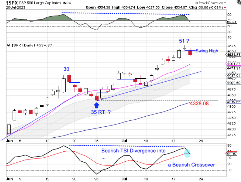 The 10 day MA did not turn lower as stocks declined into the day 35 low, therefore we are uncertain if the day 35 was a daily cycle low. Therefore the status of the daily cycle is not clear. Thursday could be day 52 of a stretched daily cycle or day 16 of the 3rd daily cycle for the current intermediate cycle. However, it appears that stocks are acting as if day 35 was the DCL. Either way stocks are due for a correction. If stocks deliver bearish follow through and close below the 10 day MA that will signal the daily cycle decline. Stocks are in a daily uptrend. They will remain in their daily uptrend unless they close below the lower daily cycle band.