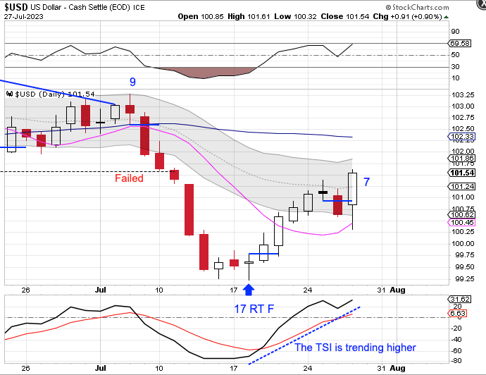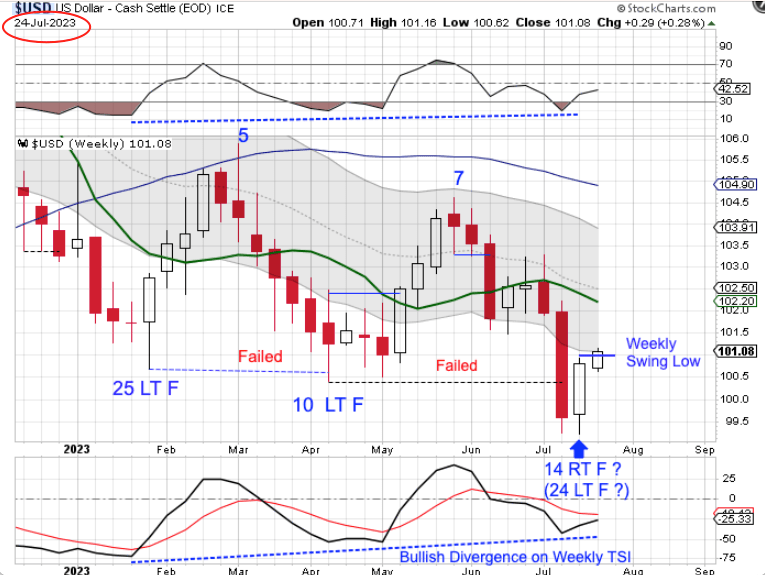 On Monday we noted that the dollar had already formed a weekly swing low. We also discussed how the dollar appears to be acting as if week 14 was week 24, which would place it in its timing band for an intermediate cycle low.