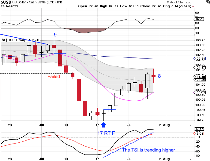 The dollar is approaching resistance at the 50 day MA. The dollar is still a bit stretched above the 10 day MA. If the day 17 DCL was also the ICL, then the dollar should break above the 50 day MA as it continues to rally out of its DCL. But if day 17 DCL was not the ICL, then we should see the dollar left translate and close back below the 10 day MA. The dollar is in a daily downtrend. The dollar will remain in its daily downtrend unless it closes back above the upper daily cycle band.
