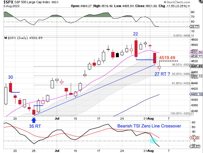 Stocks formed a swing high and closed below the 10 day MA on Wednesday. Thursday saw stocks break below the daily cycle trend line and turn the 10 day MA lower. Stocks also retraced past the 38% Fibonacci level. Thursday was day 27, placing stocks in the early part of its timing band for a daily cycle low. What stocks need is a level of support to form a swing low.