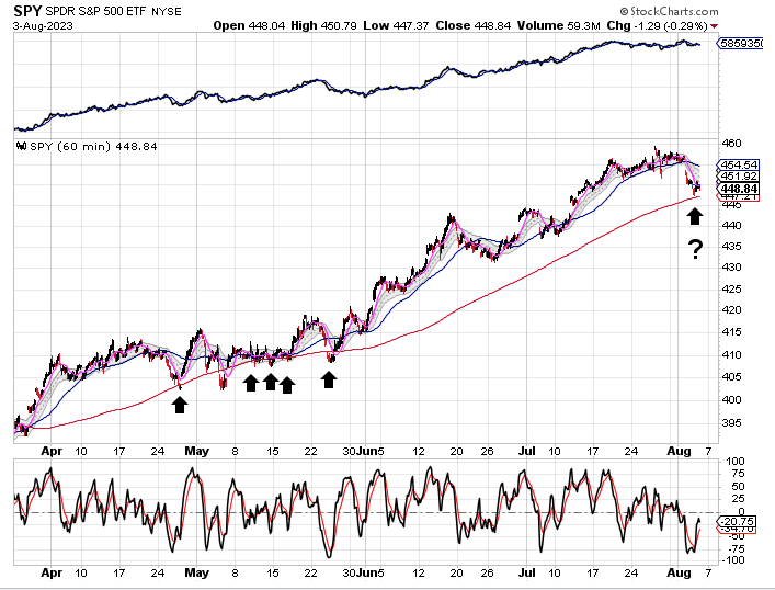 The 200 MA on the 60 minute chart has, in the past, provided support for a DCL to form. Stocks are currently in a daily uptrend. If stocks form a swing low above the lower daily cycle band and close back above the 10 day MA — that will indicate a continuation of the daily uptrend and signal a cycle band buy signal. We would then label day 27 as the DCL.