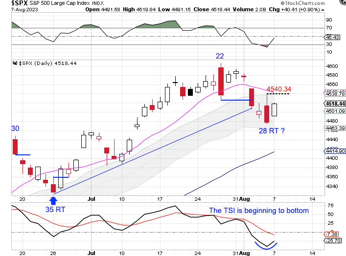 Friday was day 28, placing stocks in the early part of its timing band for a DCL. Stocks rallied on Monday, which eases the parameters for forming a swing low. Stocks are currently in a daily uptrend. If stocks form a swing low above the lower daily cycle band then they will remain in their daily uptrend and signal a cycle band buy signal — in which we would then label day 28 as the DCL. A break above 4540.34 will form a daily swing low.