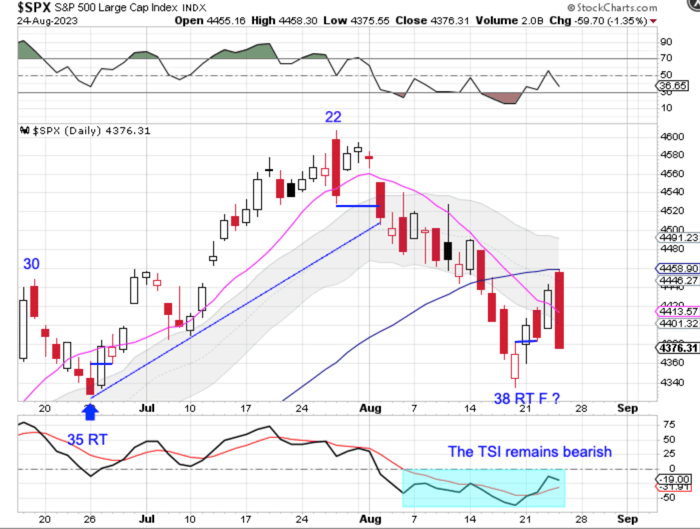 Stocks printed their lowest point on Friday, day 38 to place them in their timing and for a daily cycle low. Wednesday’s close above the 10 day MA signaled a new daily cycle. However, stocks were rejected by the 50 day MA on Thursday, closing back below the 10 day MA, which calls this into question.