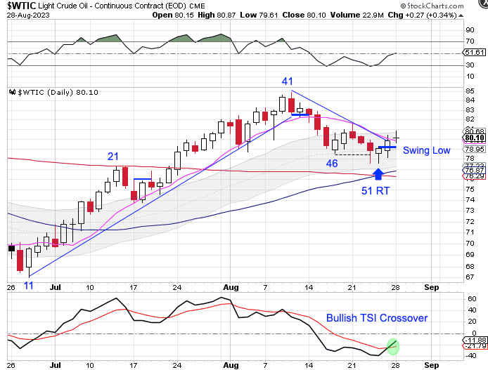 Oil printed its lowest point on Thursday, day 51, placing it deep in its timing band for a DCL. Oil formed a daily swing low on Friday. Oil is currently in a daily uptrend. Closing back above the 10 day MA indicates a continuation of its daily uptrend and signals a cycle band buy signal —so we will then label day 51 as the DCL.