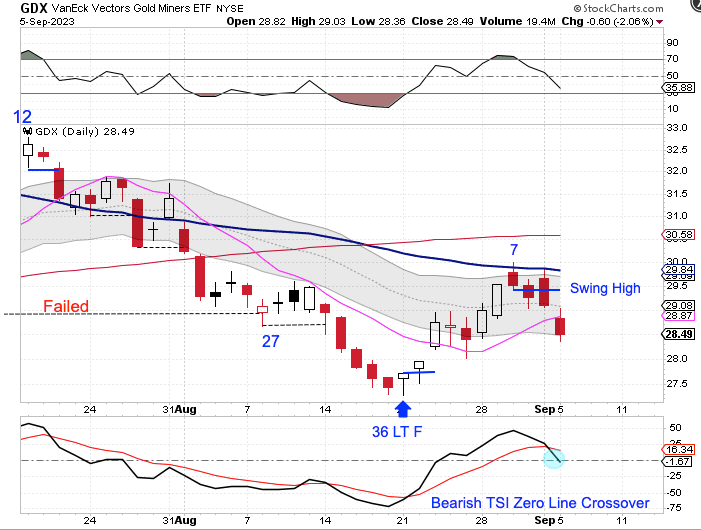 The Miners ran into resistance at the declining 50 day MA on Wednesday and formed a swing high on Thursday.